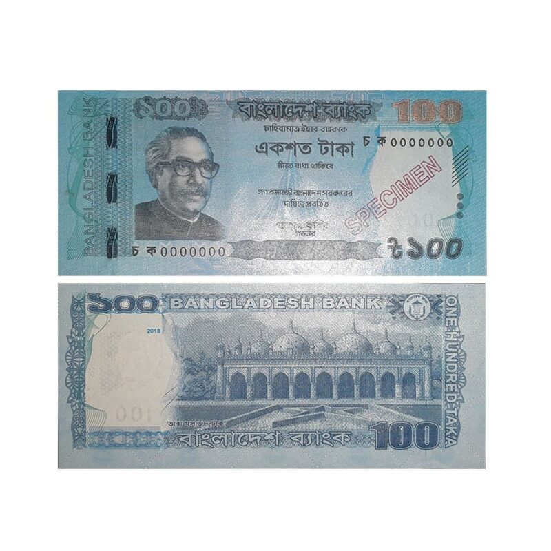- 100 Taka (Pick #57): Front – **Sheikh Mujibur Rahman**; Back – **National Martyrs’ Memorial** with eternal flame
