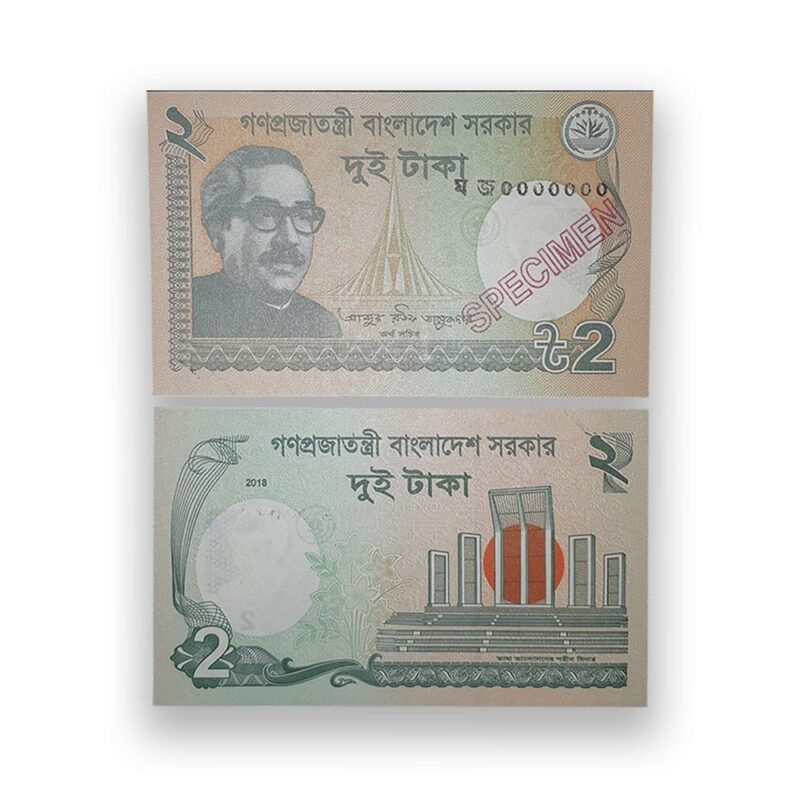 - 2 Taka (Pick #52): Front – **Portrait of Sheikh Mujibur Rahman**; Back – **Saffron (Kesari) farmers** harvesting in a field