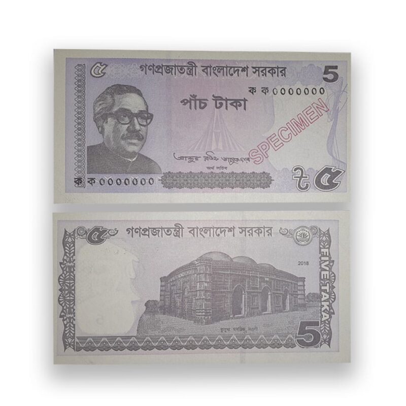 - 5 Taka (Pick #64A): Front – **Sheikh Mujibur Rahman**; Back – **National Martyrs’ Memorial** in Savar