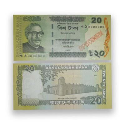 - 20 Taka (Pick #55A): Front – **Sheikh Mujibur Rahman**; Back – **Jatiya Sangsad Bhaban (National Parliament House)**